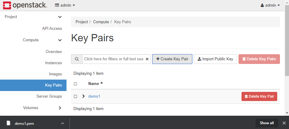 * This current Key Pair creation step is for only Admin's Project. Admin also can have a project as a user. in this step, just showing how to create Key Pair for a tenant or admin user. we should create Key pair one more for Demo1_user which we created.