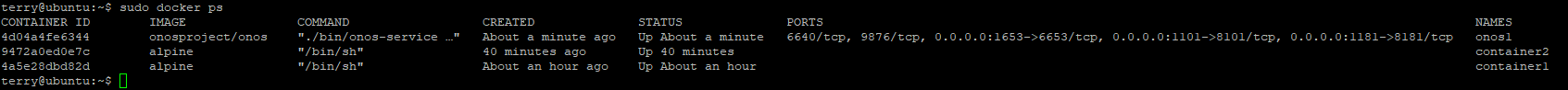 terry@ubuntu:~$ sudo docker run -t -d -p 1181:8181 -p 1101:8101 -p 1653:6653 --name onos1 onosproject/onos