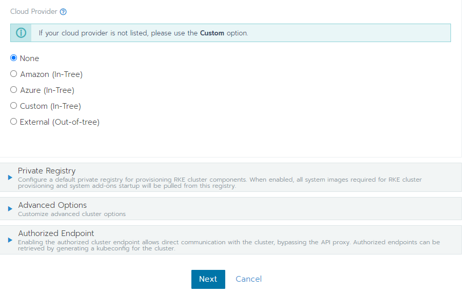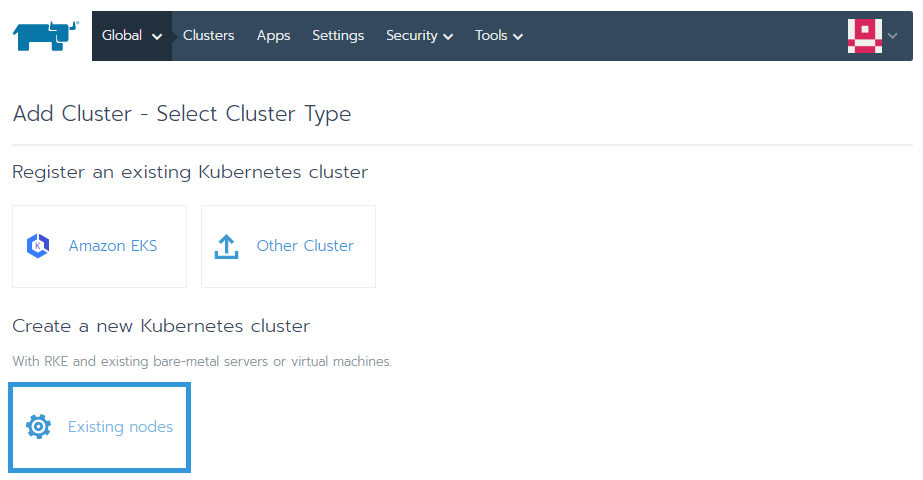 6. We are going to create a cluster on VMs of Oracle VirtualBox. Go to 'Existing nodes'.