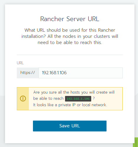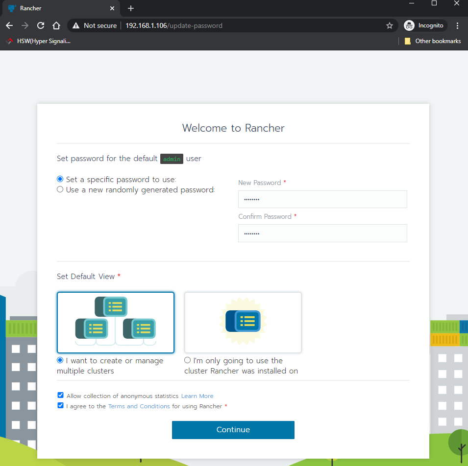123terry@ubuntu:~$ sudo docker psCONTAINER ID IMAGE COMMAND CREATED STATUS PORTS NAMES98715f22e3ba rancher/rancher "entrypoint.sh" 12 minutes ago Up 11 minutes 0.0.0.0:80->80/tcp, 0.0.0.0:443->443/tcp silly_bartikcs 3. Access 192.168.1.106:80 by Web Browser. Set your password.
