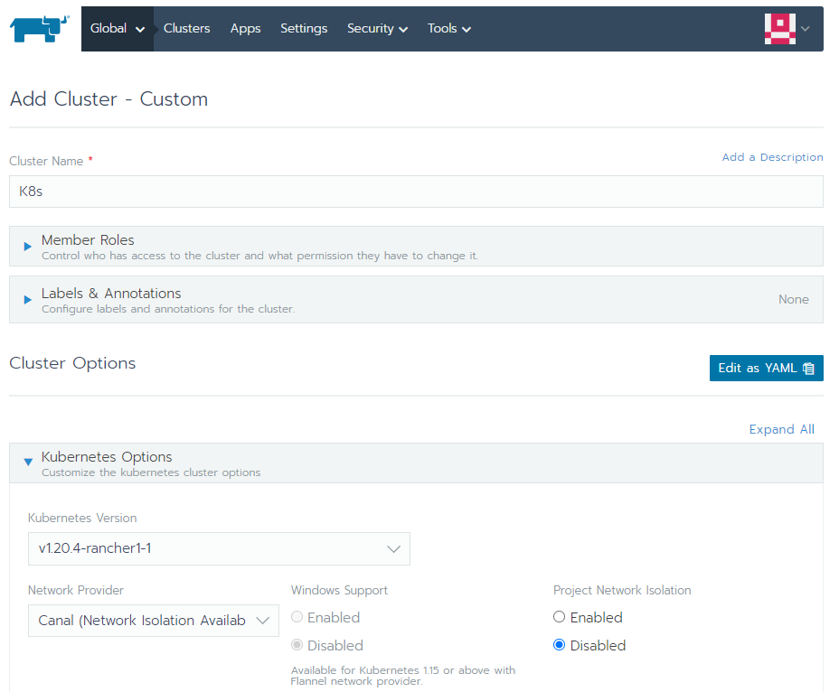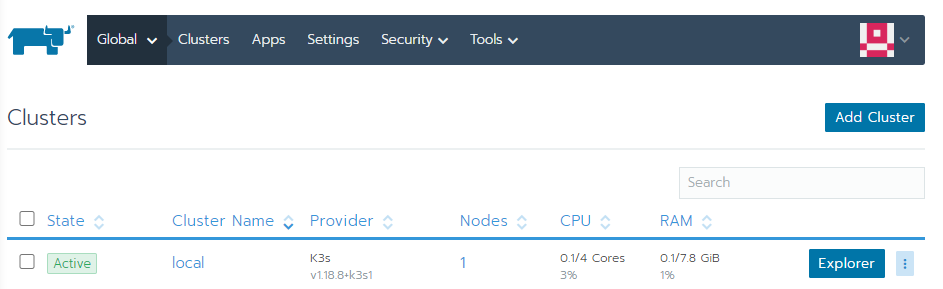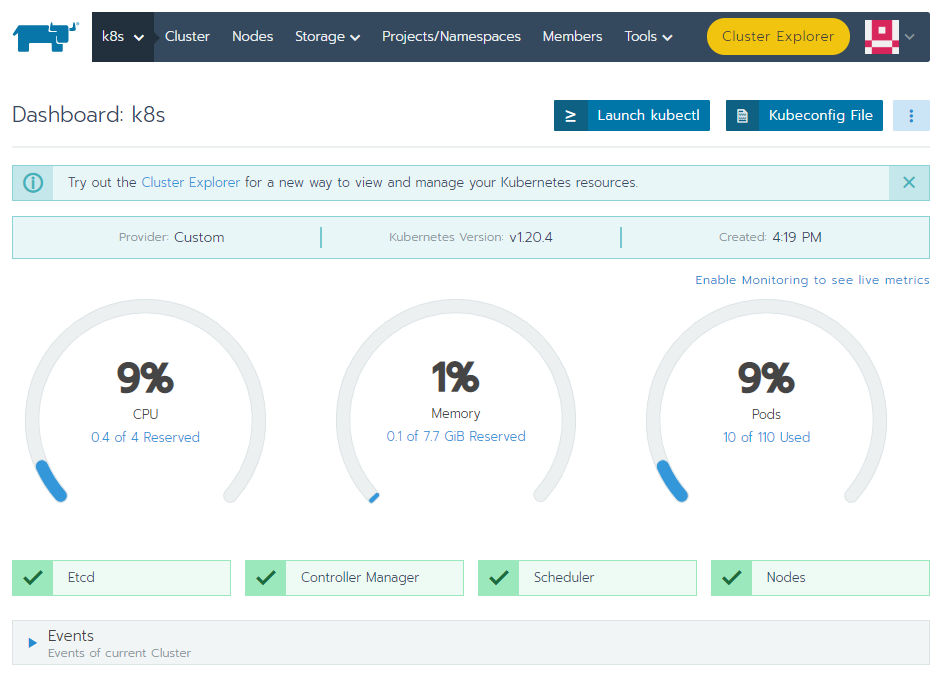 123456789101112131415161718192021222324252627282930313233343536jslab@ubuntu:~$ sudo su -root@ubuntu:~# docker psCONTAINER ID IMAGE COMMAND CREATED STATUS PORTS NAMES110e9c07dbc8 rancher/rancher-agent:v2.5.6 "run.sh --server htt…" 2 minutes ago Up 2 minutes stoic_lovelaceroot@ubuntu:~#root@ubuntu:~# docker psCONTAINER ID IMAGE COMMAND CREATED STATUS PORTS NAMES5e7b23392d83 rancher/hyperkube:v1.20.4-rancher1 "/opt/rke-tools/entr…" 23 seconds ago Up 22 seconds kube-proxy034a6c3159ff rancher/hyperkube:v1.20.4-rancher1 "/opt/rke-tools/entr…" 35 seconds ago Up 34 seconds kubeletadd1b5ea48df rancher/hyperkube:v1.20.4-rancher1 "/opt/rke-tools/entr…" 42 seconds ago Up 40 seconds kube-schedulere1fb65bdbf5f rancher/hyperkube:v1.20.4-rancher1 "/opt/rke-tools/entr…" 48 seconds ago Up 47 seconds kube-controller-managerd887e83a28ba rancher/hyperkube:v1.20.4-rancher1 "/opt/rke-tools/entr…" About a minute ago Up About a minute kube-apiserver0845b4539b15 rancher/coreos-etcd:v3.4.14-rancher1 "/usr/local/bin/etcd…" About a minute ago Up About a minute etcd110e9c07dbc8 rancher/rancher-agent:v2.5.6 "run.sh --server htt…" 3 minutes ago Up 3 minutes stoic_lovelaceroot@ubuntu:~#root@ubuntu:~#root@ubuntu:~# docker psCONTAINER ID IMAGE COMMAND CREATED STATUS PORTS NAMES85fa2b472f81 rancher/pause:3.2 "/pause" 1 second ago Up Less than a second k8s_POD_fleet-agent-77774d8bfc-nms5r_fleet-system_33b92562-a9f9-4b08-9b16-5173735e627a_799814d8850a0 rancher/pause:3.2 "/pause" 1 second ago Up Less than a second k8s_POD_calico-kube-controllers-6c8ddcb6cd-t726r_kube-system_27334927-9a40-485f-9bdb-1af7cab0bb69_1361a1e0da5763 rancher/kube-api-auth "/bin/sh -c 'kube-ap…" 3 seconds ago Up 2 seconds k8s_kube-api-auth_kube-api-auth-jf66t_cattle-system_41384742-3d9f-4d07-ad5a-2fee6dd03c4e_0b0a34e2ff0ee rancher/nginx-ingress-controller "/usr/bin/dumb-init …" 20 seconds ago Up 19 seconds k8s_nginx-ingress-controller_nginx-ingress-controller-n52v5_ingress-nginx_dbbaba32-8f14-4ccf-8658-16ffbdda54d2_09a883427b096 4cd72bf2d36b "run.sh" 29 seconds ago Up 27 seconds k8s_agent_cattle-node-agent-gcl5v_cattle-system_5e5596bc-dc33-48b1-8942-879b0546dee4_07d0e2d24b821 rancher/pause:3.2 "/pause" 29 seconds ago Up 28 seconds k8s_POD_kube-api-auth-jf66t_cattle-system_41384742-3d9f-4d07-ad5a-2fee6dd03c4e_0a2d7cc3091a1 rancher/pause:3.2 "/pause" 30 seconds ago Up 28 seconds k8s_POD_cattle-node-agent-gcl5v_cattle-system_5e5596bc-dc33-48b1-8942-879b0546dee4_07eca6c7ac1ab rancher/pause:3.2 "/pause" 46 seconds ago Up 46 seconds k8s_POD_nginx-ingress-controller-n52v5_ingress-nginx_dbbaba32-8f14-4ccf-8658-16ffbdda54d2_0bba6b34c9c24 rancher/pause:3.2 "/pause" About a minute ago Up About a minute k8s_POD_canal-tl9r5_kube-system_d56c387c-fe64-43e2-af97-a31826da2a5e_05e7b23392d83 rancher/hyperkube:v1.20.4-rancher1 "/opt/rke-tools/entr…" About a minute ago Up About a minute kube-proxy034a6c3159ff rancher/hyperkube:v1.20.4-rancher1 "/opt/rke-tools/entr…" About a minute ago Up About a minute kubeletadd1b5ea48df rancher/hyperkube:v1.20.4-rancher1 "/opt/rke-tools/entr…" About a minute ago Up About a minute kube-schedulere1fb65bdbf5f rancher/hyperkube:v1.20.4-rancher1 "/opt/rke-tools/entr…" About a minute ago Up About a minute kube-controller-managerd887e83a28ba rancher/hyperkube:v1.20.4-rancher1 "/opt/rke-tools/entr…" 2 minutes ago Up 2 minutes kube-apiserver0845b4539b15 rancher/coreos-etcd:v3.4.14-rancher1 "/usr/local/bin/etcd…" 2 minutes ago Up 2 minutes etcdroot@ubuntu:~#cs 12. If it is done, you can see that k8s Cluster is Active