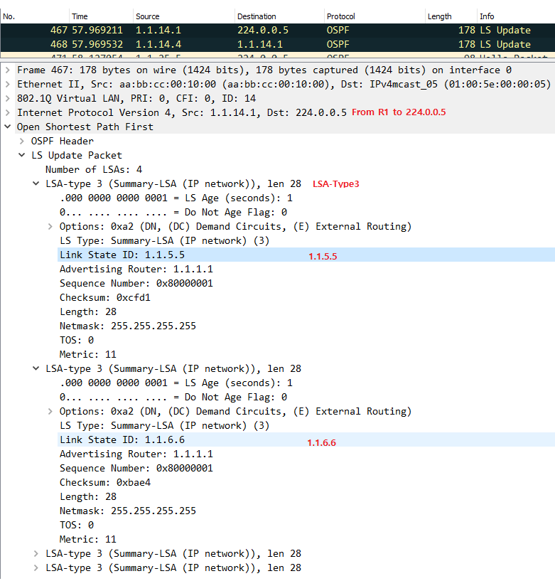 LSA Type 3는 ABR이 만들며, 다른 AREA에 소속된 네트워크를 현재의 Area에 소속된 라우터들에게 알리기 위하여 사용된다. 다른 Area에 소속된 네트워크라고 알렸다고? 같은 Area 0인데?1234567891011121314151617181920212223242526272829R1#show ip ospf databaseOSPF Router with ID (1.1.1.1) (Process ID 1)Router Link States (Area 0)Link ID ADV Router Age Seq# Checksum Link count1.1.1.1 1.1.1.1 1397 0x80000006 0x00D222 11.1.4.4 1.1.4.4 1398 0x80000008 0x00BA0F 2Net Link States (Area 0)Link ID ADV Router Age Seq# Checksum1.1.14.4 1.1.4.4 1398 0x80000001 0x000C02Summary Net Link States (Area 0) // 같은 Area 0 인데 Type2가 아니다!Link ID ADV Router Age Seq# Checksum1.1.5.5 1.1.1.1 1244 0x80000001 0x00CFD11.1.6.6 1.1.1.1 1169 0x80000001 0x00BAE41.1.25.0 1.1.1.1 41 0x80000004 0x00BADE1.1.36.0 1.1.1.1 41 0x80000004 0x00414DType-5 AS External Link StatesLink ID ADV Router Age Seq# Checksum Tag4.4.4.4 1.1.4.4 86 0x80000004 0x00E39F 0R1#