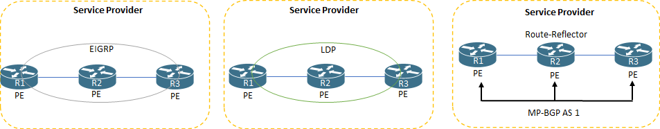 Service Provider - EIGRP > LDP > MP-BGP(vpnv4), OSPF area 0 with CE