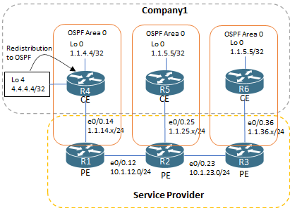 R1, R2, R3는 MP-BGP를 사용하여 Company1의 CE 라우터와 MPLS VPN로 연동하였다.CE 라우터들과는 OSPF로 연동하였고 Area는 0으로 같이 맞추었다.